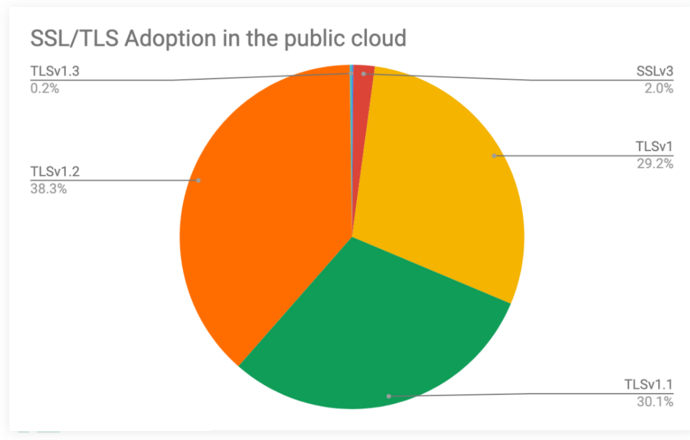 而另一项针对公共云服务的安全性评测中显示,公网中61%的公共云主机仍然使用TLSV1.1或更旧版本。目前行业标准要求TLS协议应用V1.2以上版本,避免早期版本协议中已存在的漏洞被攻击者利用,一些严重的漏洞可造成中间人攻击。