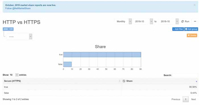 发布日期:2019-11-06根据外媒Netmarketshare发布的数据显示,截止到2019年10月全球使用HTTPS加密的Web流量的比例已经超过了九成。HTTPS网站加密传输协议几乎已经接近普及。