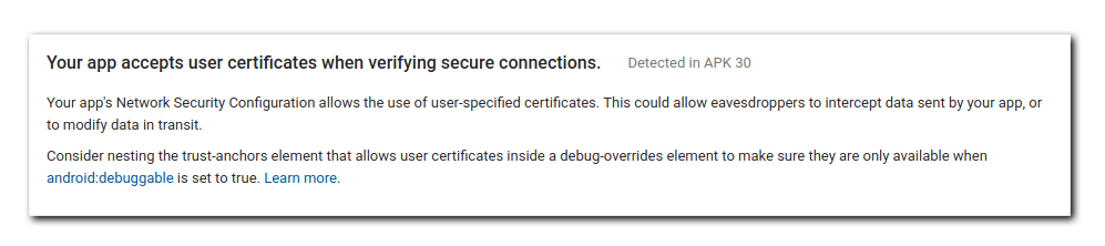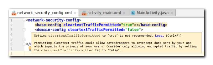 当APP包含不安全的NSC配置时(比如允许所有域名存在未加密连接,或在调试模式之外接受用户提供的证书),最新版本的Android Studio和Google Play会在发布前的报告中警告开发人员,确保开发人员了解其安全配置,鼓励整个安卓生态系统采用HTTPS加密。