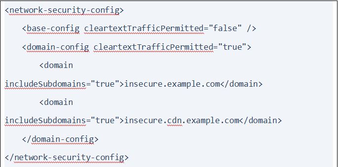 如果你的APP需要允许流量指向特定域名,可以通过添加一个NSC文件来做到这一点,该文件在默认安全策略中仅包含这些例外情况。请记住 你应该对不安全连接接收的数据保持警惕,他极有可能在传输过程中遭遇篡改。