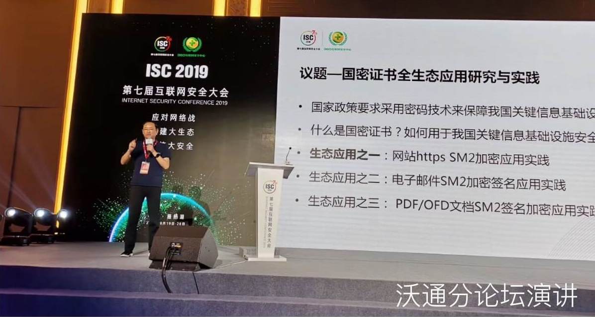 沃通CA携国密证书全生态应用产品和解决方案亮相ISC 2019互联网安全大会。沃通CTO王高华先生出席大会并受邀在“关键信息基础设施保护分论坛”发表演讲《国密证书全生态应用研究与实践》。