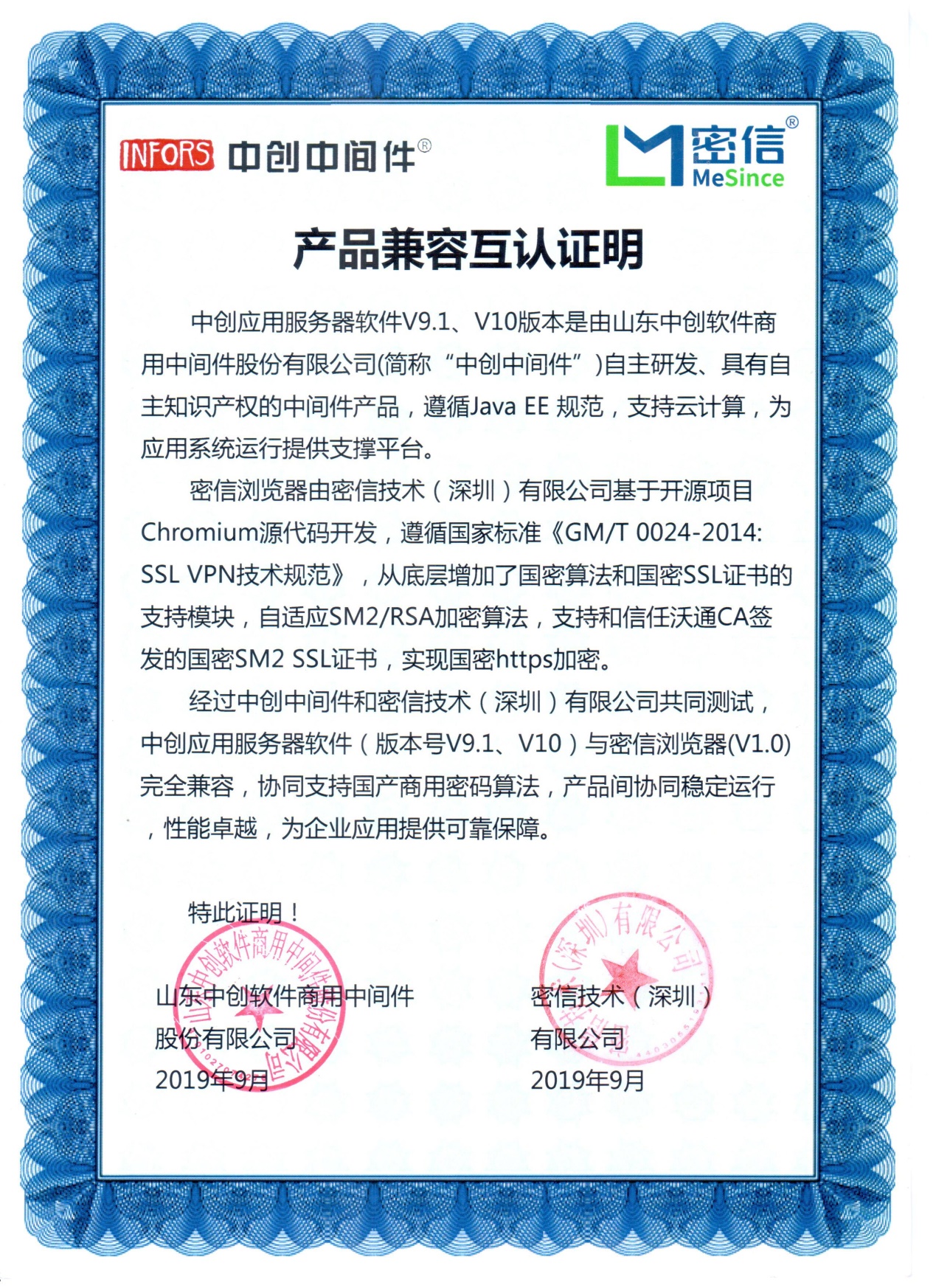 密信技术与山东中创中间件共同完成密信浏览器与中创应用服务器软件的产品兼容测试,并共同签发产品兼容互认证明,确认两款产品完全兼容,并全面支持国产密码算法。
