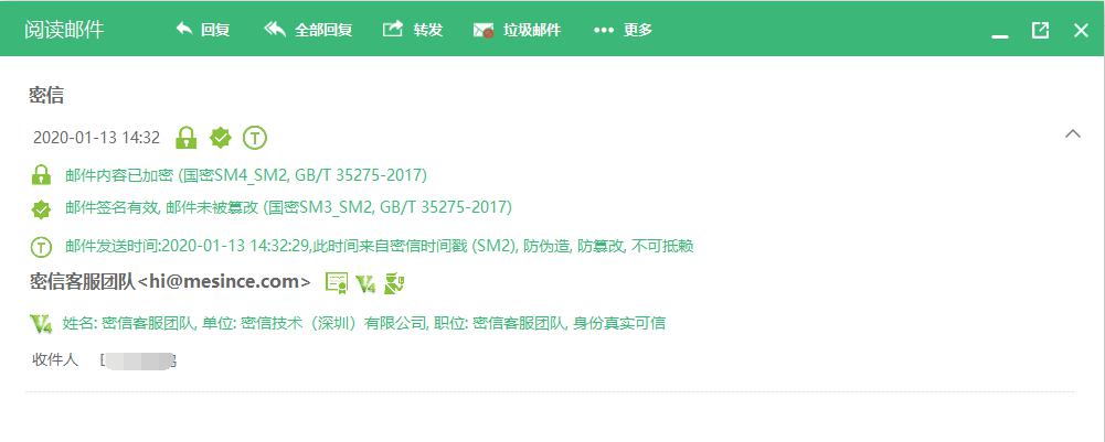 密信(邮件客户端)正式版隆重上线,为全球用户提供身份认证服务,提供不同级别的个人认证、单位认证,并在用户界面展示V2/V3/V4认证标识,表明发件人身份通过相应级别验证,身份真实可信。