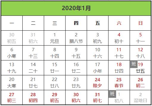 春节假期:2020年1月24日—30日,共7天,1月31日上班。其中,1月24日(除夕)至26日(初二)将安排值班人员手机值班,1月27日(初三)至 30日(初六)均安排正常值班。1月19日(星期六)、2月1日(星期日)正常上班。