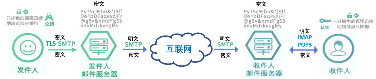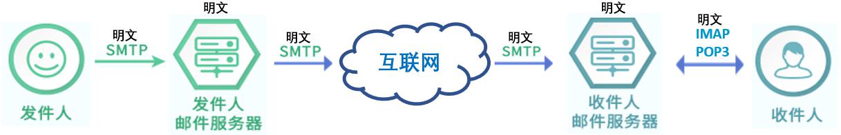 我们先来看看电子邮件的发送机制,分析清楚为何电子邮件的安全性还需要改进。电子邮件每天都在交换大量的个人和商业机密信息,但是绝大多数邮件都是通过明文传输到邮件服务器,并以明文形式储存在云端服务器中,收件人再明文收到邮件。如下图所示,这是一个巨大的大数据安全隐患!
