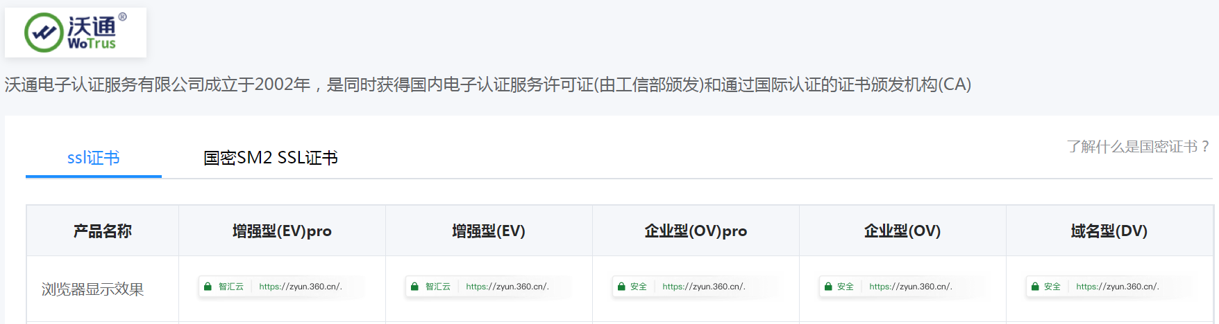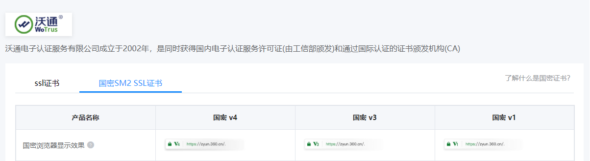 (2)沃通国密SSL证书是国密合规的SSL证书产品,遵循国家标准技术规范并参考国际标准,支持SM2/SM3/SM4国产密码算法和国密安全协议,使用国密算法实现SSL加密连接及服务器身份认证,通过自主可控的密码技术,保护数据传输安全和服务器身份可信。此次上线360智汇云的沃通国密SSL证书涵盖V1、V3、V4等全线国密SSL证书产品,均兼容360浏览器、密信浏览器、红莲花浏览器等支持国密算法的浏览器。沃通CA已经联合全国17家CA机构推广国密SSL证书及“SM2/RSA双SSL证书”应用,360智汇云是沃通国密SSL证书首个云服务合作平台,也因此成为国内首个提供国密SSL证书产品的云服务平台。