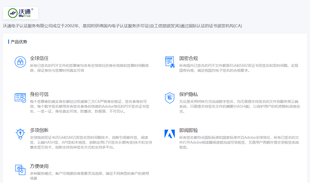 (3)我签电子签名服务是沃通CA及全资子公司密信技术共同推出的电子签名服务,是一个面向全球用户的全面创新的、方便快捷的电子文档数字签名服务和电子合同签署服务,所有文档和合同文件全部采用Adobe全球信任的PDF签名证书和国密合规的文档签名证书实现双签名和双时间戳,确保全球信任和国密合规。我签电子签名服务上线360智汇云“电子签章”应用频道,提供密信APP手动签署、公有API接口调用、软件应用安装、私有化部署等多种接入方式。