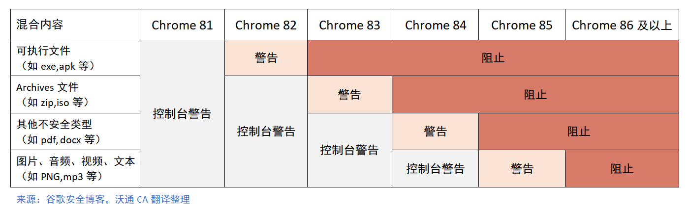 在Chrome 84(于2020年8月发布)中:Chrome浏览器将阻止混合内容的可执行文件,归档文件和磁盘映像;Chrome浏览器会警告所有其他混合内容下载,但图片,音频,视频和文本格式除外。