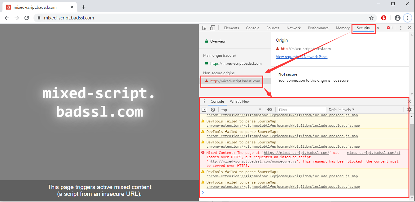 使用Chrome的“开发者工具”查找网页是否存在混合内容。访问需要测试网页,打开开发者工具,选择“Security”-"Non-Secure Origin",就可以看到混合内容。