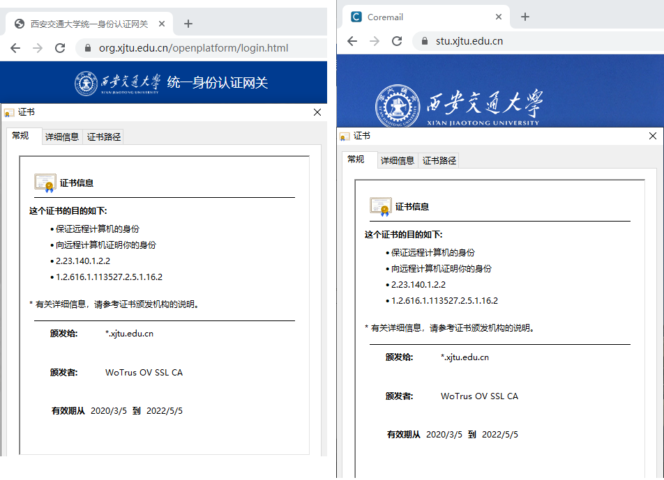 西安交通大学是我国最早兴办、享誉海内外的著名高等学府,是国家教育部直属重点大学。疫情发生以来,传统的课堂教学秩序受到前所未有的冲击,为落实教育部“停课不停教、停课不停学”要求,西安交大明确春季学期的课程教学采取线上线下相结合的方式开课,采取集教学改革、教学研究、教学组织、教学保障于一体的“线上+线下”教学新体系。西安交通大学校务邮件系统、统一身份认证网关、政务OA办公系统、网络信息中心等相关信息系统均部署了沃通SSL证书,采用HTTPS加密协议保护信息系统数据传输安全,保护师生个人隐私信息及高校教务教学数据的安全性,保障信息系统身份真实可信。