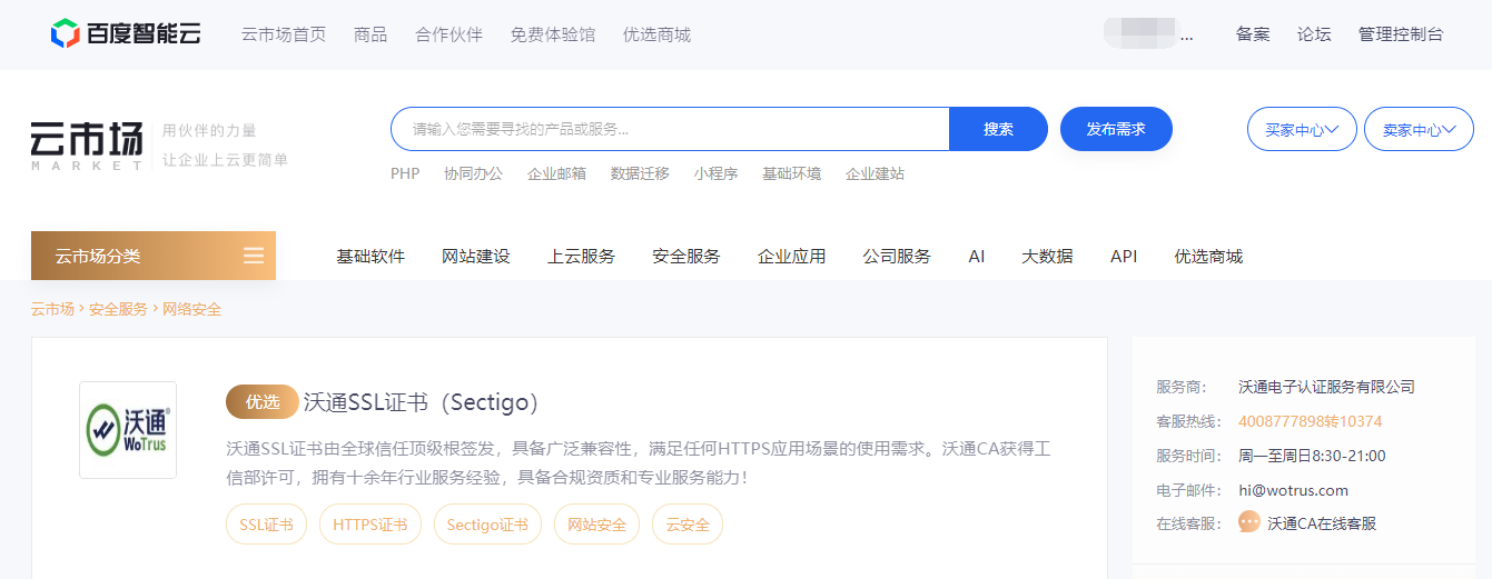 百度云市场企业用户可以在云市场搜索“沃通SSL”获取沃通SSL证书产品链接,根据需要在线选购沃通SSL证书系列产品,沃通CA提供官方售前咨询、售中服务和售后支持,无缝对接百度云市场企业用户需求,百度云市场用户可通过产品页右侧服务商信息栏联系沃通客服。