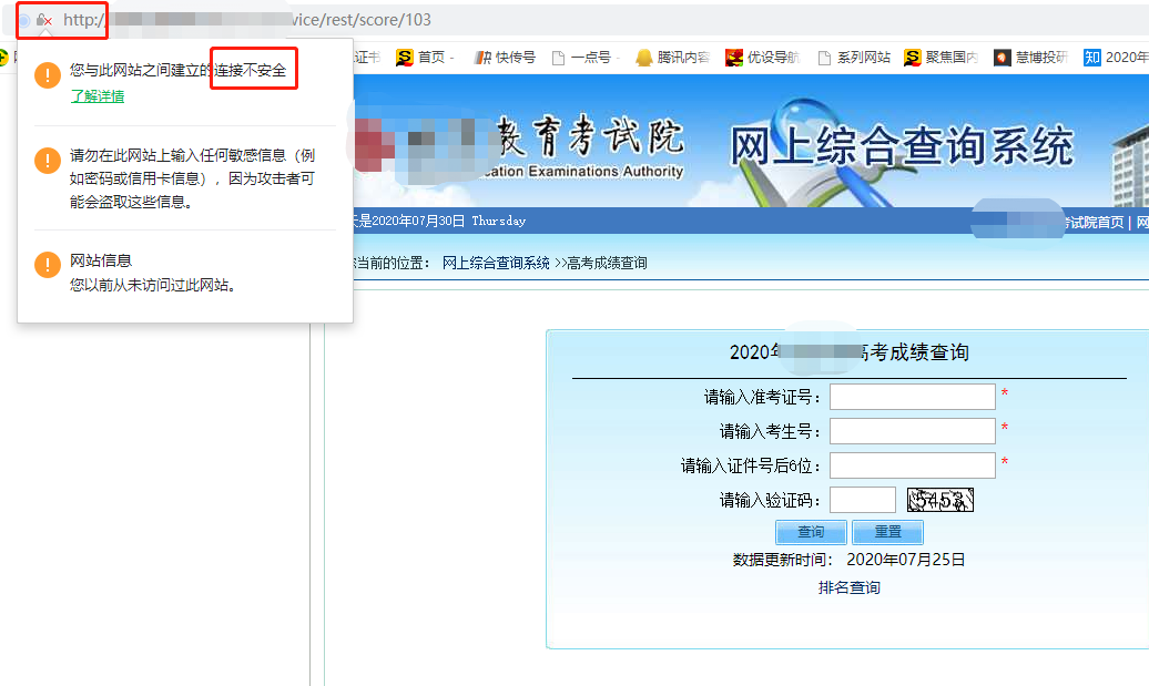 比如用户通过HTTP协议访问成绩查询系统和高校网站时,浏览器和服务器之间是明文传输,这就意味着考生填写的密码、帐号、交易记录等机密信息都是明文,随时可能被泄露、窃取、篡改,被黑客加以利用。