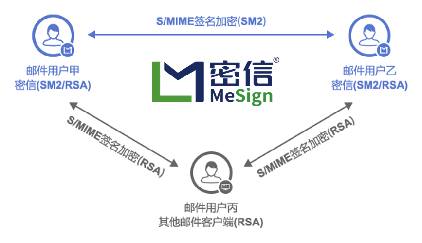 我国信创体系的邮件加密和数字签名使用率非常低,部分已使用证书加密和签名的应用,都惯性使用RSA证书,为此,沃通密信技术创新实践“SM2/RSA双证书自适应”应用模式,是国密邮件加密的全球独家创新,实现了用国密算法(SM2/SM3/SM4)、国密证书加密和数字签名每一封电子邮件。密信邮件客户端对国密算法的全面支持,解决了政务邮件的国密合规问题,让国密算法来保障信创系统所有邮件的全程安全。