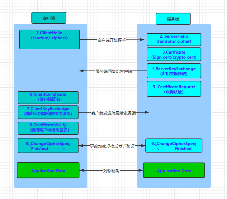 10.到此整个国密SSL握手的流程就结束了,协议双方会使用协商出来的对称秘钥对通信的数据进行加解密。