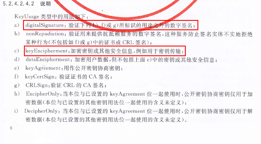 答案很简单,那就是看证书里面的扩展项--秘钥用法(KeyUsage)这一项。在《GMT 0015-2012 基于SM2密码算法的数字证书格式》协议5.2.4.2.2中就说明了证书的各种秘钥用法,见下图: