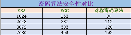 闲话少说,言归正传。我们先从秘钥来开始我们今天的内容。密钥和证书是整个TLS加密的基石。只有拥有健壮的秘钥才能防止攻击者进行模拟攻击。目前来说对于秘钥的使用,RSA密钥普遍使用2048位,而ECC秘钥普遍使用256位。行业里也默认采用2048位RSA秘钥和256位的秘钥是安全的。RSA加密算法和ECC加密算法都属于非对称加密算法。理解起来比较可能比较抽象,我们来进行一个简单对比。比如:2048位的RSA算法加密其安全性相当于112位的对称密钥加密。加密位数越高,其安全性越高,这是肯定的。与此同时,位数越高,其运算速度就会越慢。现在ECC算法的使用也逐渐兴起,其算法速度比RSA的更快,效率更高。国密局推出的SM2算法也是属于ECC算法,属于众多椭圆曲线中的一条国产的椭圆曲线。为了方便大家更好的对比,下面列举一个算法安全性对比简图。