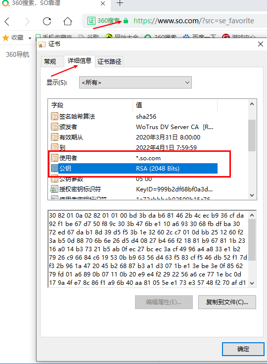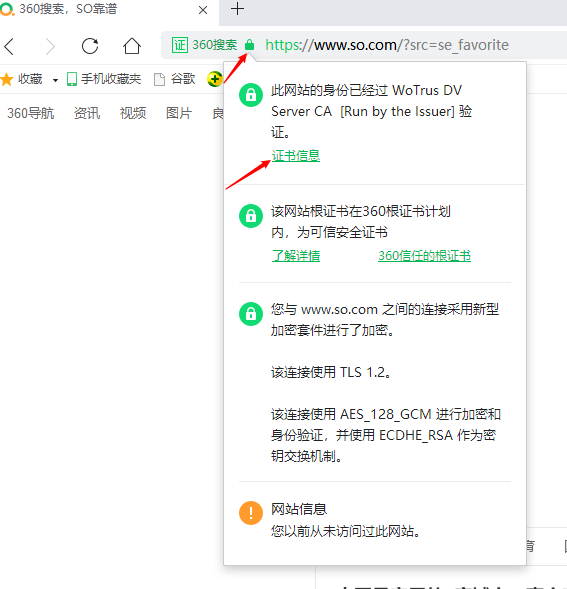 好了,讲了这么多概念性的东西,接下来我们看看如何查你访问的站点证书的密钥位数。以(360浏览器为例,见下图),在浏览器里面点击域名前面的小锁标记,就可以看到证书信息选项,点击后即可查看证书的详细内容,在这里面就会有描述证书的密钥位数,是不是很简单,各个浏览器对于证书查看和展示稍微有点不一样,但基本上都是大同小异。