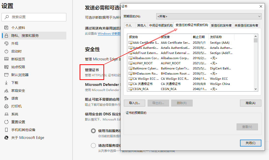 在配置服务端证书的时候,仅配置我们申请到的证书是不够的。需要配置完整的证书链才能保证我们的部署是完整的。因为浏览器在验证证书是否可信的时候,是通过证书链来验证的。用中级证书验证你申请的服务器证书是否可信,用顶级根验证中级根是否可信。验证的逻辑是逐级进行。顶级根的可信性则来源于浏览器或者操作系统中预置的根证书。以Edge浏览器为例,你在浏览器设置里就有受信任的根证书颁发机构(见下图),这里面就可以查看到预置的根证书。