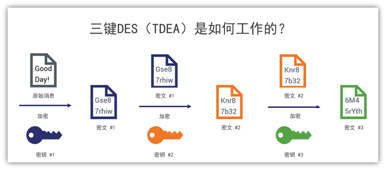 这是一个简化流程图,解释了TDEA如何将纯文本数据加密为无法解密的密文。使用多个密钥会使处理数据的速度变慢,并增加了计算开销,这就是企业经常跳过3DES并直接使用AES的原因。