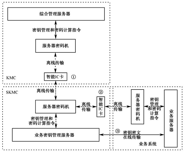 ①KMC向SKMC离线分发密钥:KMC利用离线方式通过智能IC卡将SKMC主密钥和SKMC(加密)密钥对从服务器密码机分发到SKMC的服务器密码机中。