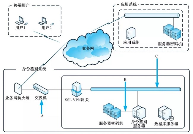 ②在机房部署身份鉴别服务器,调用服务器密码机,完成身份鉴别协议逻辑的实现。