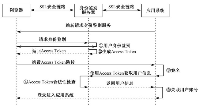 ⑤ 应用系统关联用户账户。身份鉴别服务器通过SSL安全通信链路将请求的用户信息返回给应用系统,应用系统根据用户信息进行账号关联。