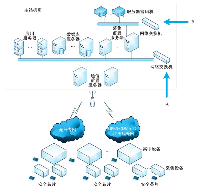 为防范系统经过公网信道执行数据采集、参数和控制指令下发操作时,通信双方非授权主体的假冒,关键信息被截获、篡改、重用等风险,密码应用方案设计和密码应用安全性评估的重点在于主站和采集设备之间的身份鉴别,以及系统重要数据在传输和存储过程中的保密性和完整性保护。