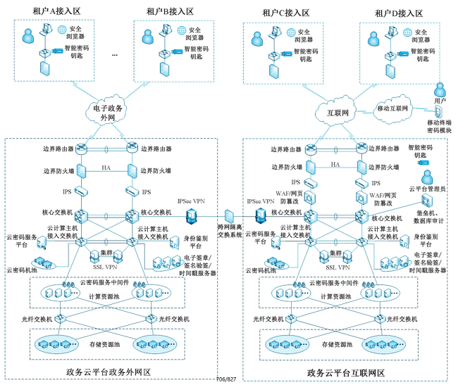 政务云系统是运用云计算技术,整合现有机房、计算、存储、网络、安全、应用支撑等资源,形成统一服务的综合平台,实现不同电子政务系统间的信息整合、共享、交换和政务工作协同。相比于传统信息系统,政务云系统在安全方面面临新的挑战。一方面,政务云系统中主机边界、网络边界模糊,风险不但来自南北流量(外部用户与内部服务器之间的流量),同时也来自东西流量(内部服务器之间的流量);另一方面,云系统承载多个单位的业务系统,各单位的业务系统可能需要密码来支撑自身的业务服务。因此,政务云系统需要将密码作为一种服务,为这些系统提供支撑。