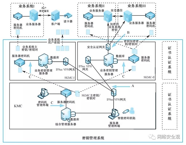 密钥管理系统密码应用部署如下图所示(图中的A、B、C为测试工具接入点)。该系统由KMC(密钥管理中心,Key Management Center)和SKMC(密钥管理分中心,Sub-KMC)两部分组成,最上层的业务系统不在密钥管理系统的边界之内。