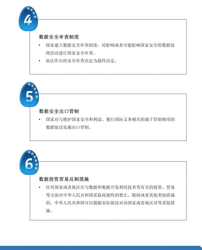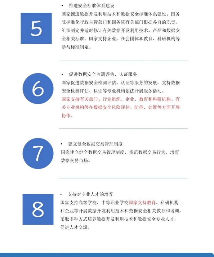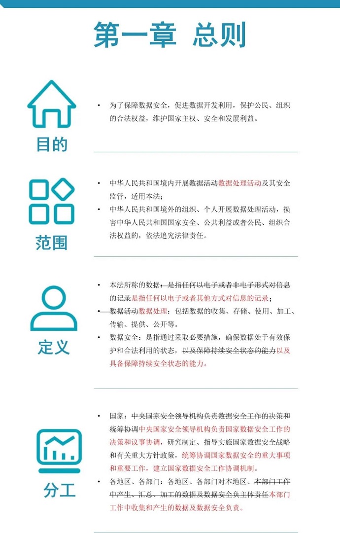 全国人大常委会法工委发言人臧铁伟介绍称:作为数据领域的基础性法律,对这些意见法工委在草案修改过程中进行了认真研究,拟提请本次常委会审议的数据安全法草案立足数据安全工作的实际,聚焦数据安全领域的突出问题,确立了数据分类分级管理,数据安全风险评估、监测预警、应急处置,数据安全审查等基本制度,明确相关主体的数据安全保护义务,通过建立健全各项制度措施,进一步提升国家数据安全保障能力,有效应对数据这一非传统领域的国家安全风险与挑战,切实维护国家主权、安全和发展利益。在规范数据活动的同时,草案坚持安全与发展并重,对支持促进数据安全与发展的措施、推进政务数据开放利用等作出相应规定,充分发挥数据的基础资源作用和创新引擎作用,促进以数据为关键要素的数字经济发展。