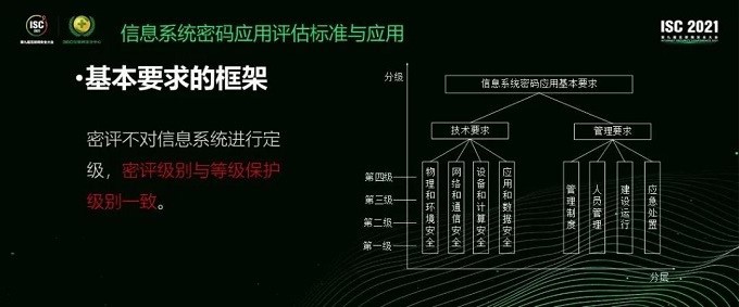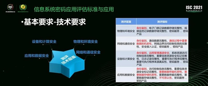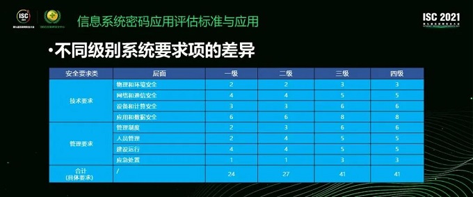 上图表示的是GB/T 39786里面不同级别的不同要求项,大家可以看到,二级跟三级之间的要求项差别比较大,三级跟四级要求项一样,但是他们要求的尺度是不一样的。大家如果看过GB/T 39786的标准就知道我们的标准会分为“应、宜、可”为三个不同尺度的要求,根据系统的实际情况来判断要不要做,但是对于责任单位可以自己来决定这一条要不要用密码技术来做。