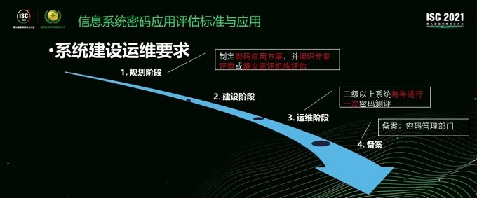 对于系统建设运维的整个生命周期,基本上可以划分为四个阶段,比较重要的而且跟等保不太一样的是在规划阶段,特别强调要制定商用密码方案,并且这个方案要进行专家评审,或者提交给专业的测评机构进行评估,这是为什么呢?因为从目前情况来看,很多建设单位或者集成单位,其实对密码的认知不是特别深入,如果直接开始建,有可能造成成品并不符合要求的严重后果,所以在前期设计的时候,需要严谨的把关,因此需要先对方案进行评审,评审过后再去建,这样可以保证后期不需要整改,或者整改的内容少很多。到了运维阶段,目前要求三级以上的系统每年测评一次,最后到密码管理部门进行备案。