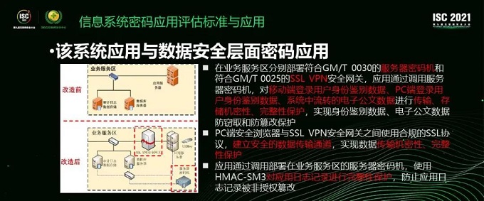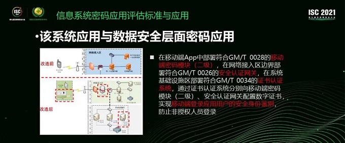 这个方案(上图所示)是一个在应用和数据安全层面的例子,在应用安全层面,怎么做密码的设计,比如说改造前,系统的大概情况是怎么样的,改造后的目标是身份鉴别的例子。因此第一步,我要部署什么样的设备,是一个移动端的身份鉴别,在移动端部署一个移动端的密码模块,再接入区部署一个安全认证网关,在基础设施区有一个CA系统发证,通过这几个设备实现移动端登录用户的身份鉴别,这就是一个整体思路。