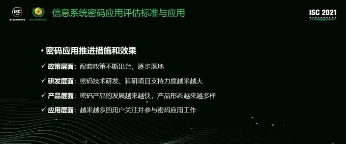 4、应用层面,越来越多的用户单位开始关注商用密码的应用,会做相关密码合规的咨询。通过最上层的政策,通过产品和技术的研发,通过最终用户的落地实施,虽然可能会面临一些困难,但是最终密码应用的前景是非常广阔的。