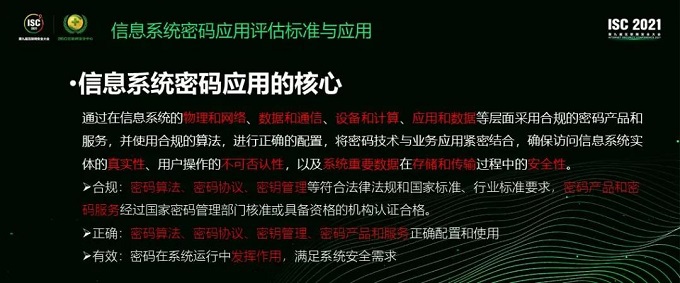 当我们做信息系统密码应用的时候,会提到三个词:合规、正确、有效。“合规”是指在信息系统的物理和网络、数据和通信、设备和计算、应用和数据等层面,使用的密码算法、密码协议、密钥管理是否符合法律法规以及行业标准的要求;“正确”是指是否部署认证的产品、相关的算法密码协议是否进行正确的配置和使用;“有效”则是指相关应用部署之后能否起到有效作用,最终保护信息系统的安全。
