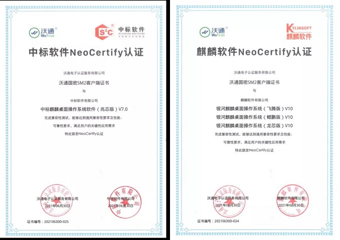 中标麒麟、银河麒麟等桌面操作系统与沃通国密客户端证书完成兼容性互认测试 ,沃通国产化发展又上一步台阶