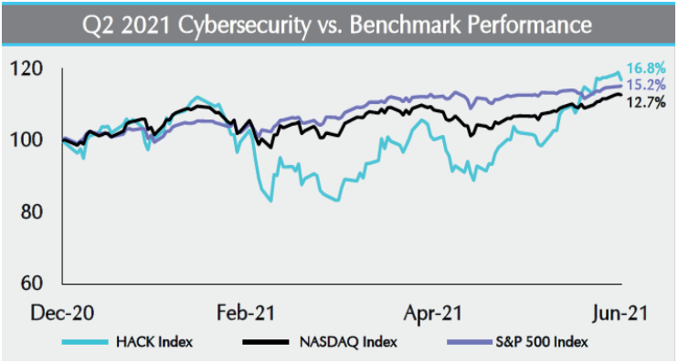 全球市场来看,二级市场网络安全上市公司指数 Hack Index,截至 2021 年 6 月 21 日,比 2020年 12 月 20 日上涨 16.8%,表现好于 NASDAQ 指数和标普 500 指数。
