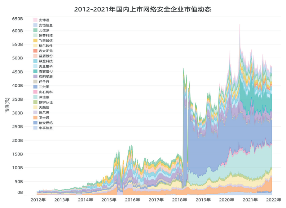2021 年,国内网络安全产业总市值与 2020 年相比略有下降,但网络安全创业投资市场空前活跃。