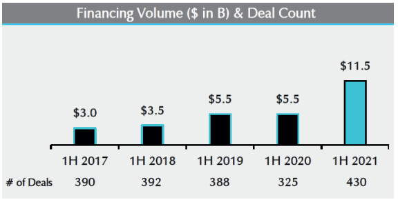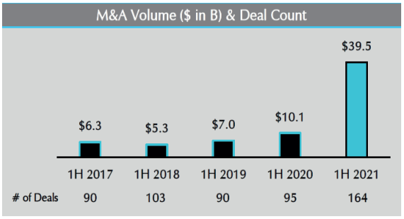 全球范围内来看,网络安全创业投资都是空前活跃。如图 3 图 4 所示,2021 年上半年,全球网络安全市场的收购和兼并从数量到金额都远高于前四年。
