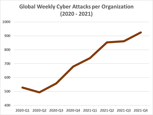 发布日期:2022-01-12网络安全公司 Check Point Research 最新发布的一份 2021 年调查报告指出,从 2020 年中期到 2021 年,网络攻击的数量呈上升趋势。这一趋势在 2021 年年底达到了历史最高水平,在全球范围内达到每个组织每周遭受 925 次网络攻击的峰值。总体而言,与 2020 年相比,研究人员在 2021 年发现每周对企业网络的攻击增加了 50%。