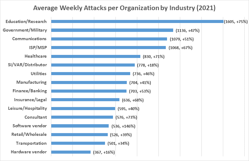 2021 年第 4 季度,每个组织的每周遭受的网络攻击达到历史最高水平,每个组织的攻击次数超过 900 次。其中,教育/研究领域是遭受攻击最多的行业:每个组织平均每周发生 1605 次攻击,相较 2020 年增加了 75%。紧随其后的是政府/军事部门,每周有 1136 次攻击(增加 47%);以及通信行业,每个组织每周有 1079 次攻击(增加 51%)。