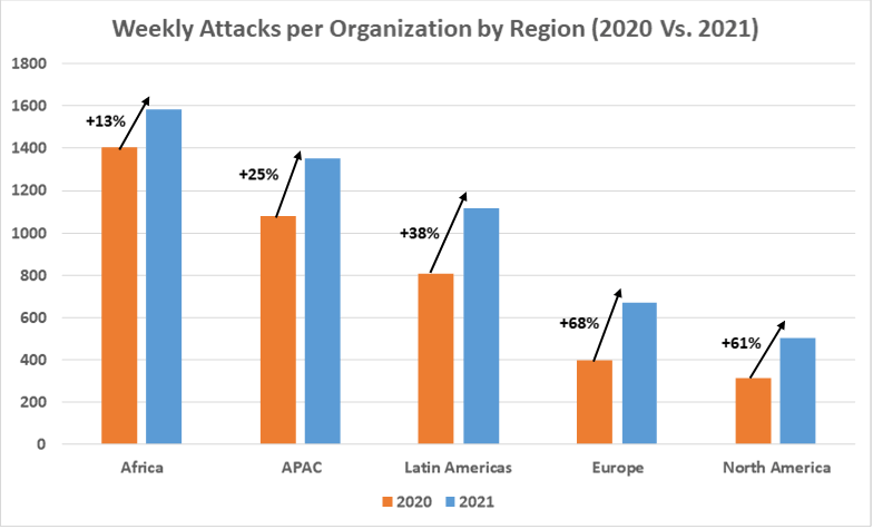 按地区划分时,非洲在 2021 年经历了最多的攻击,每个组织平均每周发生 1582 次攻击;比 2020 年增加了 13%。紧随其后的是亚太地区,每个组织平均每周发生 1353 次攻击(增加 25%);拉丁美洲,每周发生 1118 次攻击(增加 38%);欧洲,每周发生 670 次攻击(增加 68%);和北美,每个组织平均每周发生 503 次攻击(增加 61%)。