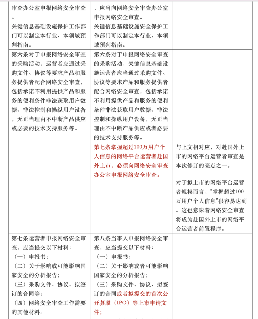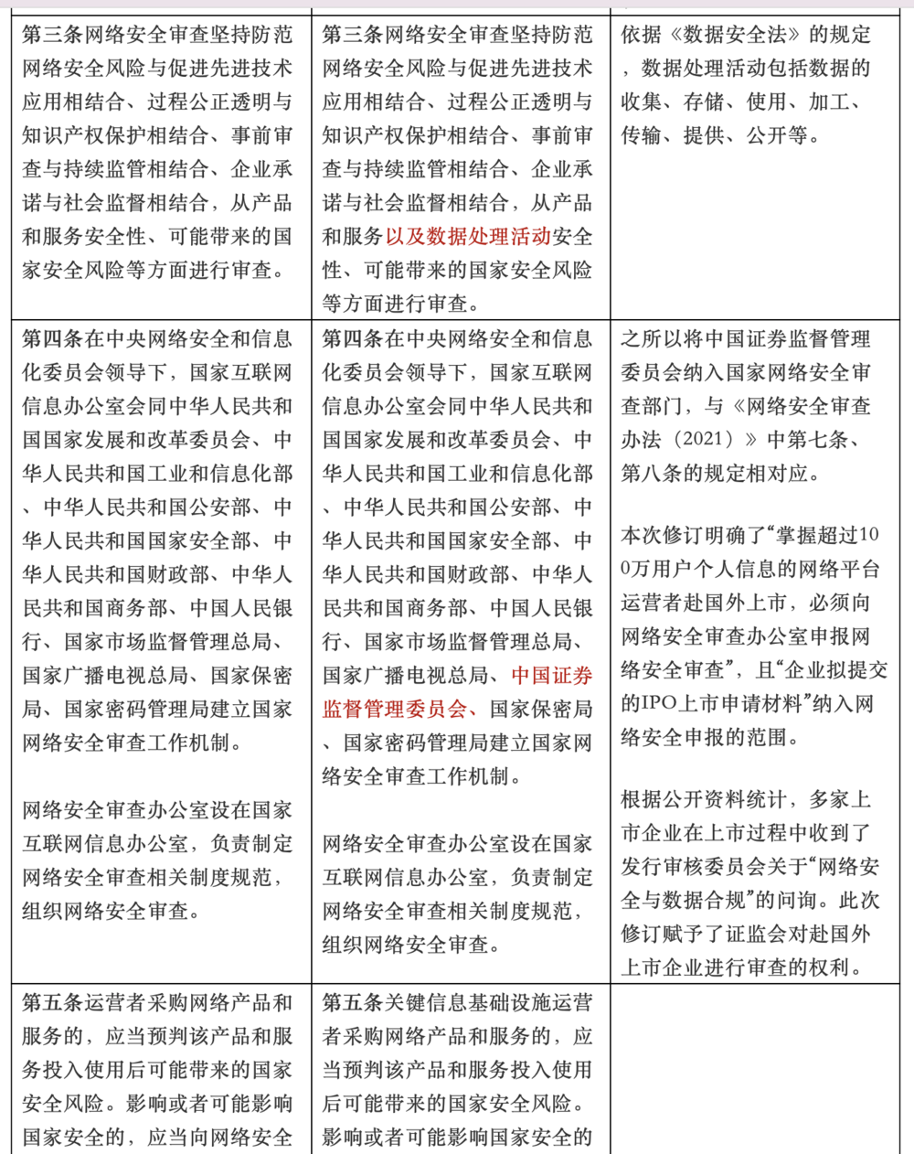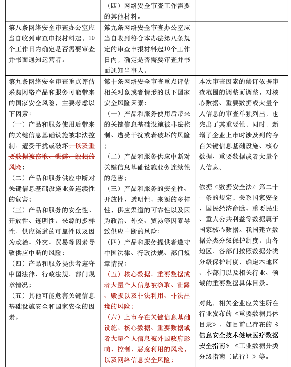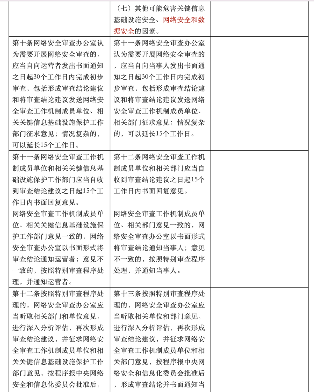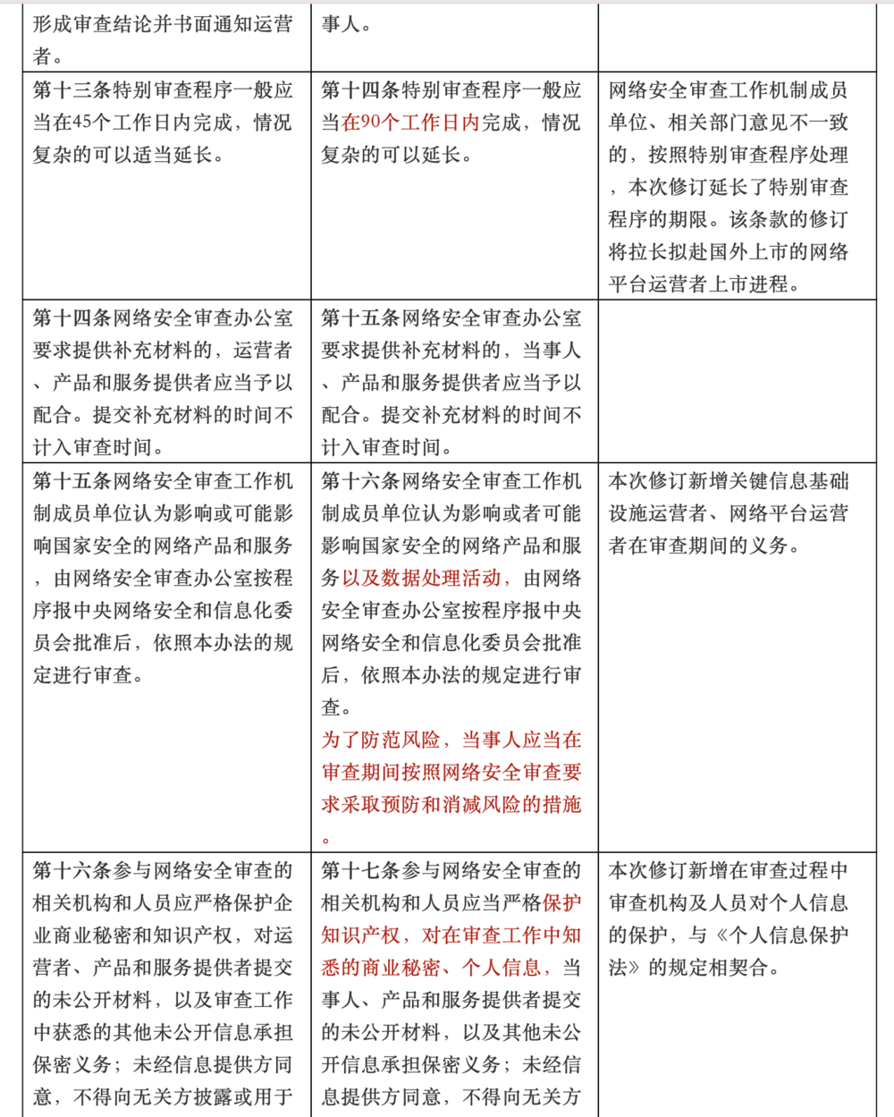 关于审查程序和内容方面,一方面延长了特别审查程序的审查时间,增加了关键信息基础设施运营者、网络平台运营者在审查期间的义务;另一方面,审查考虑要素也基于审查范围的扩大,增加了核心数据、重要数据或者大量个人信息、上市企业关键信息基础设施等角度,使得监管更加完善。