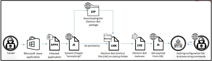 感染链开始于受害者从微软商店中安装已被克隆的游戏软件,在启动时,后台会动态加载一个JavaScript滴管,以获取Electron Bot的有效载荷并进行安装。恶意软件会在系统下一次启动时运行,并连接到 C2,检索其配置并执行攻击者的任意命令。由于主要的脚本在运行时动态加载,存储在设备内存中的JS文件非常小,看起来也很无害。