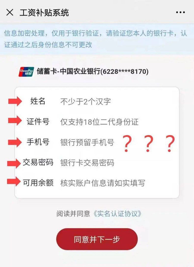 如果这时候还没有意识到这是诈骗网站,继续点击“马上进入申领”,则会进入到诱导输入银行卡密码与身份证的界面。