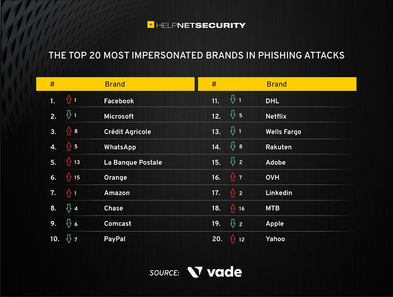 发布日期:2022-03-09安全公司Vade 公布了2021年度在网络钓鱼中被冒充最多的20个品牌排名。报告分析了去年全年间184977封钓鱼邮件中附带的欺诈性链接,其中,Facebook从2020年的第二位上升至2021年的第一位,占总数的14%,其次是微软,占13%。