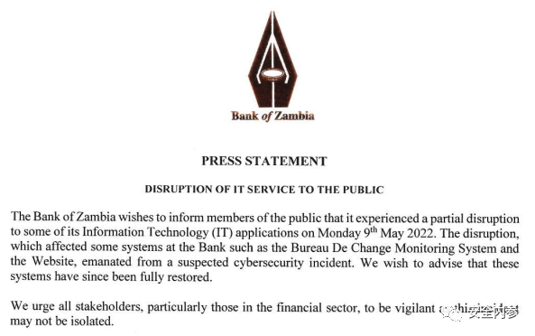 5月13日,赞比亚银行发布公告称,在5月9日(上周一)遭受可疑的网络攻击,部分信息技术应用中断服务,包括外汇管理局监控系统和网站。