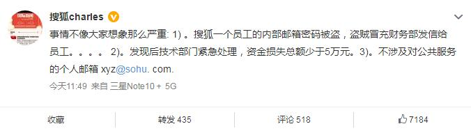 随后,搜狐 CEO 张朝阳回应称,事情不像大家想象那么严重,搜狐一个员工的内部邮箱密码被盗,盗贼冒充财务部发信给员工,发现后技术部门紧急处理,资金损失总额少于5万元。