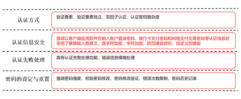 在规范中,强调了检测金融客户端身份认证方式、认证信息安全输入和展示、认证失败处理机制以及密码的设定与重置方面的安全性,其中认证信息安全性需要开发者重点检查认证信息输入时是否具有安全性措施,并强调以客户端应用软件在输入账户登录密码、银行卡支付密码和网络支付交易密码等认证信息时采用了替换输入框原文、逐字符加密、字符加密、防范键盘窃听、自定义软键盘,或者通过其他方式保证攻击测试无法获取输入信息的明文作为通过标准。