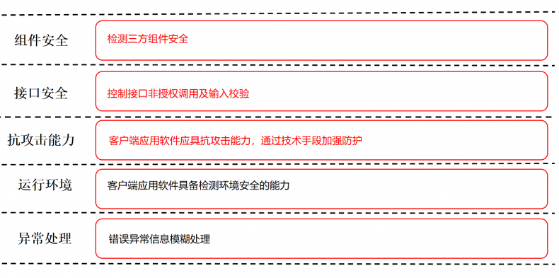 此项强调了金融客户端组件安全、接口安全、客户端抗攻击能力以及环境检测的检测要求,全面检测客户端三方组件、H5、接口,其中应通过有效手段检测客户端软件是否具备抵御静态分析、动态调试、防篡改的能力,安全检测、安全防护、客户端运行环境检测全方位考量已经成为金融行业客户端安全能力建设的必要手段。